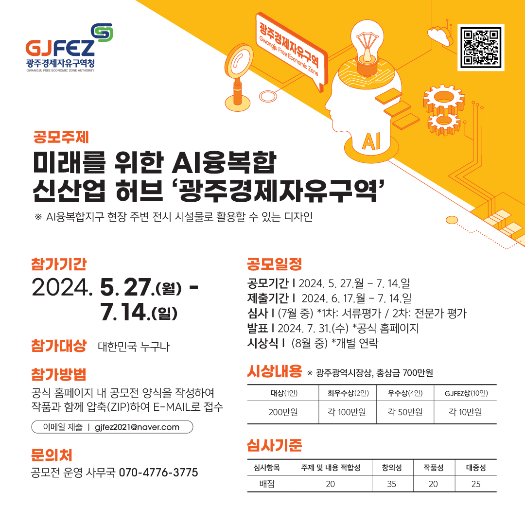 - 공모 내용: 광주경제자유구역청(GJFEZ)에서는 AI융복합 산업 도시 광주와 광주경제자유구역의 이미지 제고를 위한 앰비언트 광고 아이디어를 공모합니다.