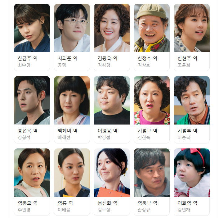 등장인물들의 캐릭터가 정말 살아있어요! 특히 기범 부모님, 갈빗집 부부 케미는 꼭 챙겨보셔야 해요. 현실에 있을 법한 B급 감성이 귀엽고 정감 갑니다.