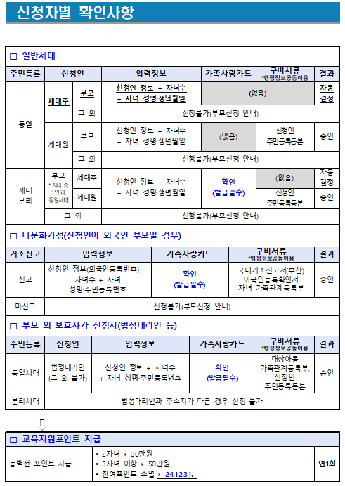 - 동일세대 : 부모 중 세대주 ☞ 신청 즉시 결정 및 지급 *부모 중 세대원 신청시 추가심사 후 선정