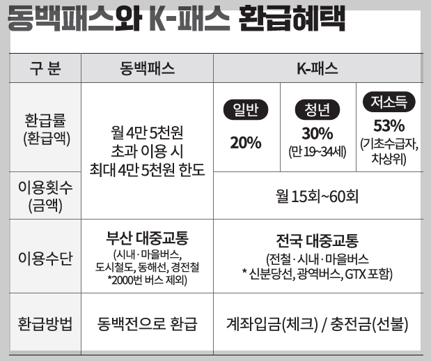 K패스-동백은 두 제도의 장점을 결합하여, 동백패스와 K패스 환급액 중 더 높은 금액을 자동으로 환급받을 수 있도록 합니다. 이는 부산 대중교통 이용 요금이 월 4만 5천 원에 미치지 못해도, K패스를 통해 환급 혜택을 받을 수 있게 함으로써 대중교통 이용자의 범위를 더욱 확대했습니다.