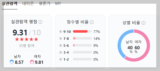 <동화지만 청불입니다> 네이버 평점은 실관람객 평점은 높은편이지만 네티즌 평점은 낮은편입니다.