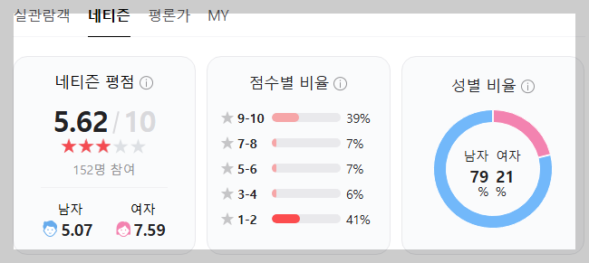 <동화지만 청불입니다> 네이버 평점은 실관람객 평점은 높은편이지만 네티즌 평점은 낮은편입니다.
