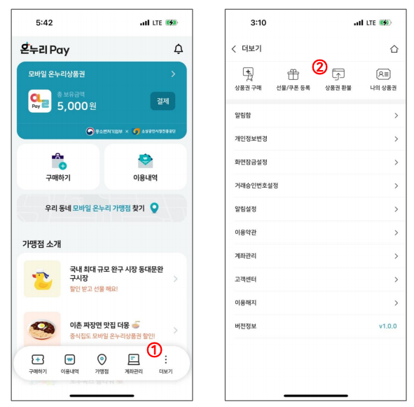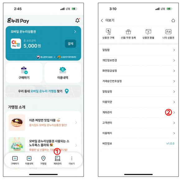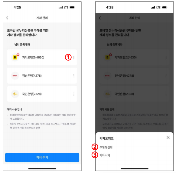 상품권 구매와 환불을 위한 계좌를 관리할 수 있습니다. |