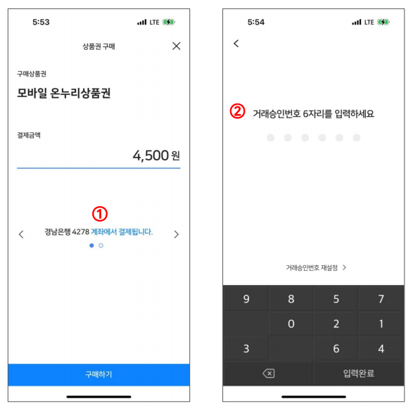 결제할 은행 출금 계좌 선택 후 거래승인번호를 입력하면 됩니다.