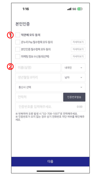 본인인증단계입니다. 개인정보를 입력하고 휴대폰 인증까지 마친 후 다음단계로 넘어갑니다.