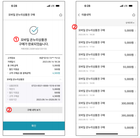 상품권 구매에 대한 상세 정보와 구매 내역을 확인할 수 있습니다.