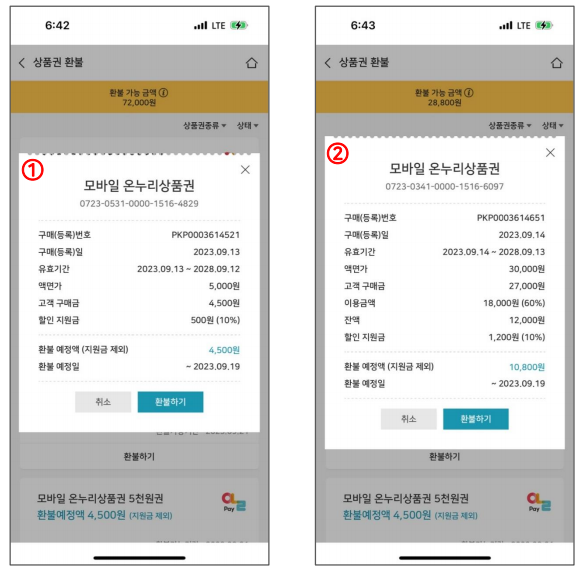 이용내역에서 상품권 환불 정보를 확인할 수 있습니다. |