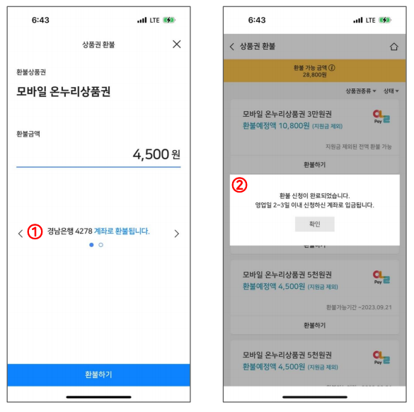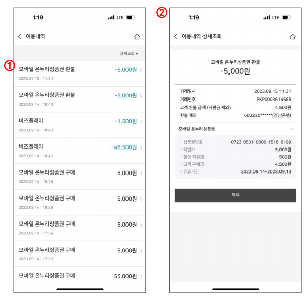 이용내역에서 상품권 환불 정보를 확인할 수 있습니다.