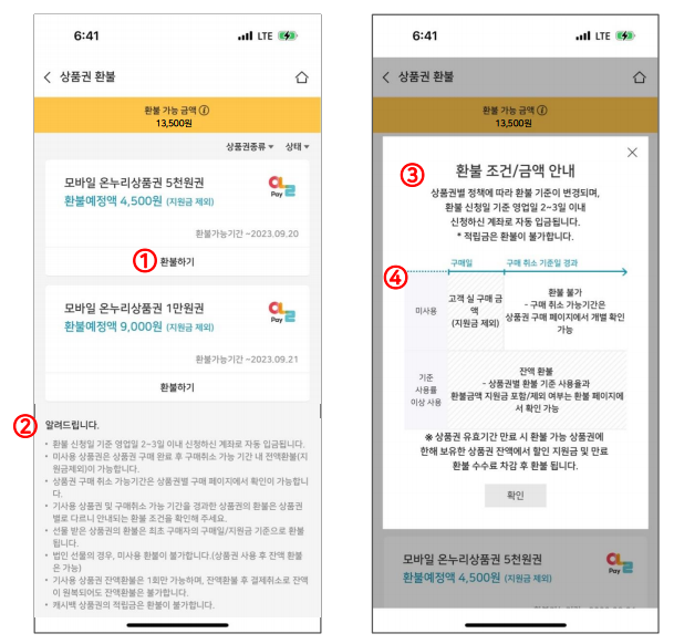 상품권 환불 메뉴에서 구매한 상품권을 환불 할 수 있습니다.