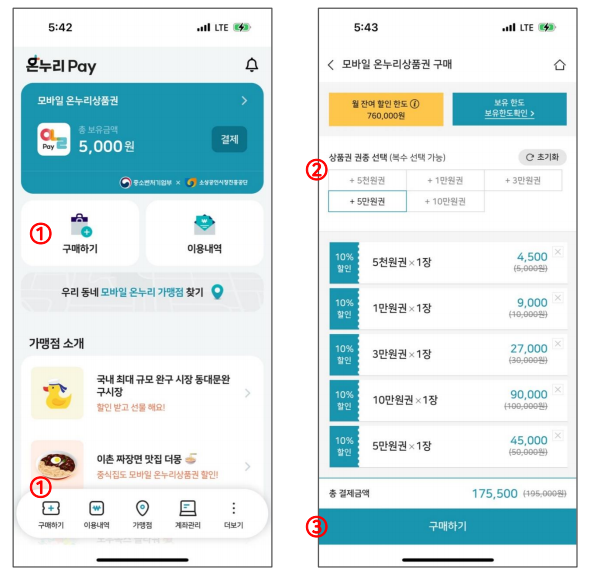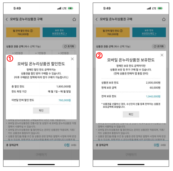상품권 구매시 할인 한도 및 보유 한도 정보를 확인합니다. |