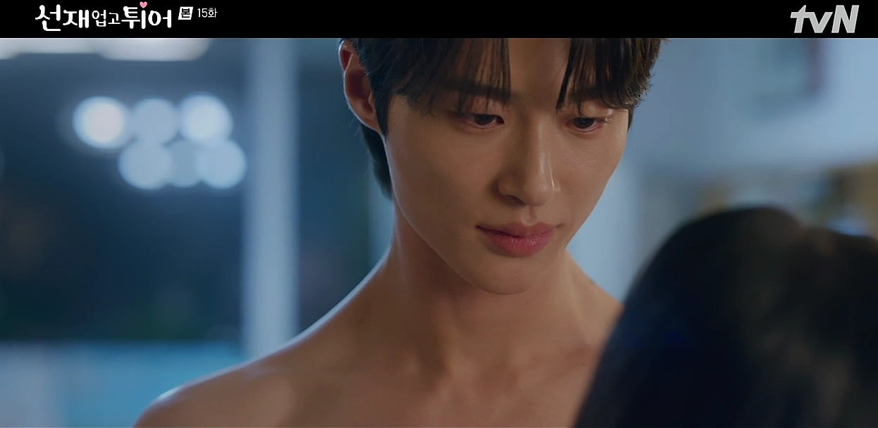 선재는 솔을 피하려고 미끄럼틀로 숨어들지만 핸드폰을 떨어뜨려 들키고 맙니다. 솔의 조카가 토를 하는 상황에서 선재는 옷을 벗고 나와 씻어야 하는 상황이 연출됩니다. 이를 본 솔은 깜짝 놀랍니다. 가족들이 잠든 틈에 선재는 솔의 집을 나가려다 문틈 사이로 솔과 눈이 마주치고, 과거에 그녀와 키스했던 장면을 떠올리며 당황합니다.