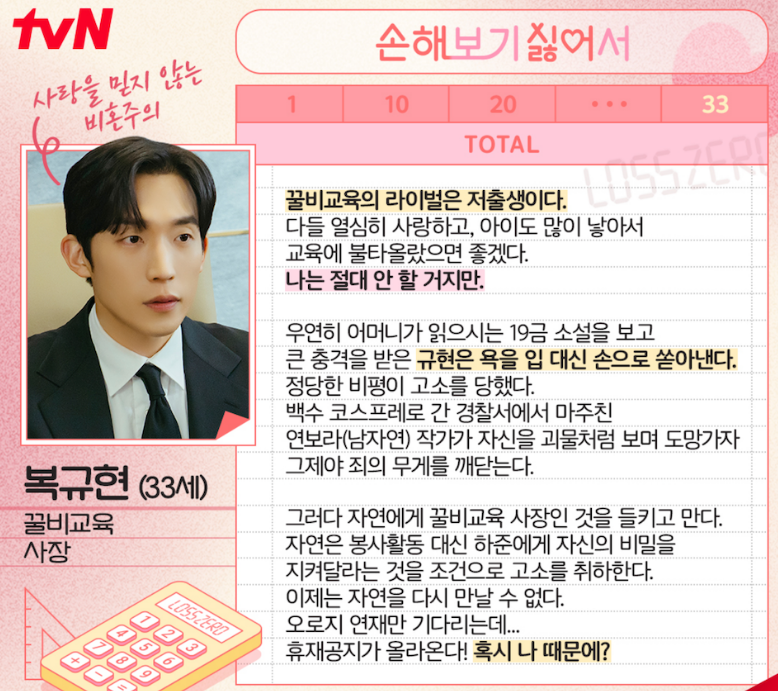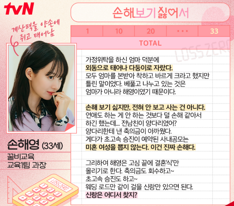 손해영은 꿀비교육의 교육1팀 팀장으로, 인생도 사랑도 손해를 보지 않기 위해 손익 계산이 빠른 인물인데요.