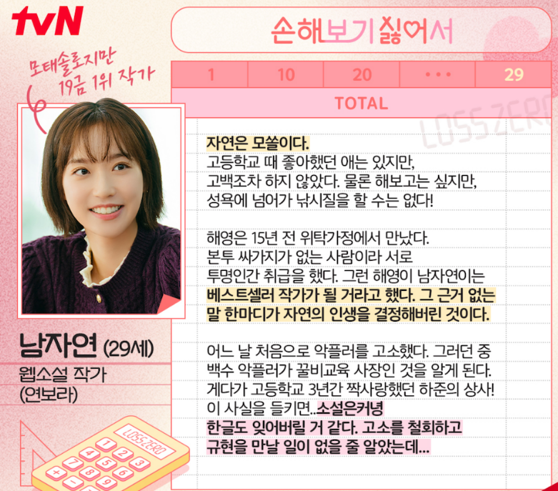 오늘부터 이제 막 시작된 tvN 월화드라마 <손해보기 싫어서>는 로코물을 사랑하는 시청자들에게 큰 기대를 받고 있는 작품인데요.
