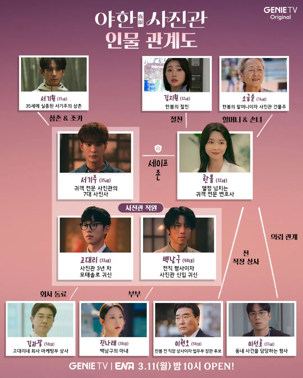 - 고대리 (배우 유인수) & 백남구 (배우 음문석): 사진관에서 귀신들과 함께 일하는 특별한 직원들로, 각각의 개성과 스토리가 있습니다.