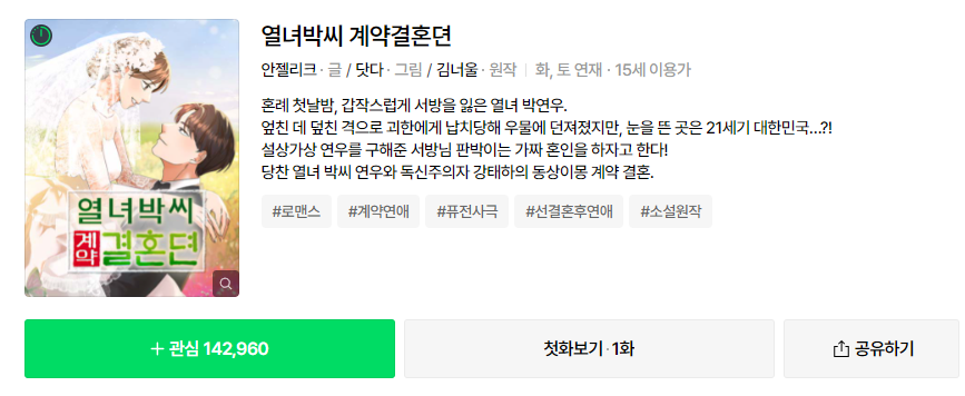 이 작품은 19세기 조선시대의 유교걸인 박연우와 21세기의 감정이 없는 최고의 강태하라는 인물이 주인공인, 마치 금쪽 같은 계약 결혼 이야기를 그리고 있습니다.