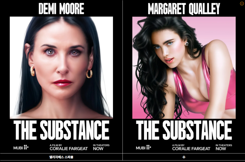 특히 데미 무어는 실제 60세의 나이에도 불구하고 50세의 엘리자베스를 완벽하게 소화하며, 데미 무어의 변신이 인상적이라는 평을 받았으뎌, 너무나 매력적인 마거릿 퀄리 역시 젊고 매혹적인 '수' 역을 통해 강렬한 인상을 남겼는데요.