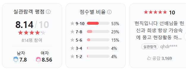 당연히 예상되는 결과로 영화 <소방관>을 본 관객들의 반응은 대체로 호평 일색입니다.