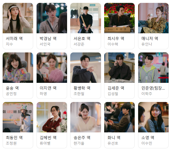 황병학 이사(조한철)는 내모 스튜디오 내 권력자로, 윤송 작가의 표절 논란을 처리하는 등 조직 내 결정권을 쥔 인물. 민준영(이학주)은 경남의 친구로 미래와 경남의 관계에 관여하는 인물. 두 사람 모두 직장 멜로 서사의 현실감을 높이는 역할을 합니다.