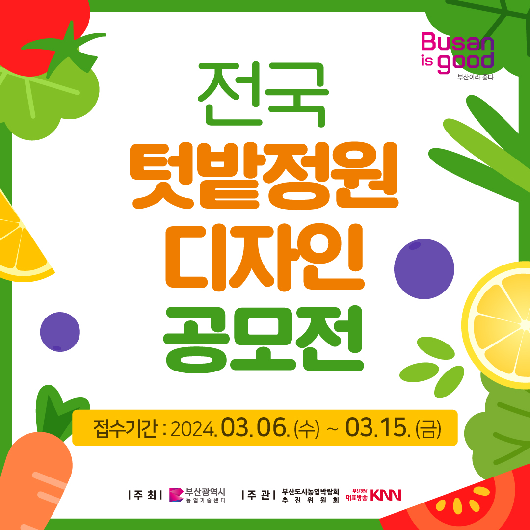 전국 텃밭정원디자인 공모전이 개최됩니다. 이 공모전은 도시경관과 어울리는 아름답고 환경 친화적인 텃밭정원 모델을 발굴하고, 시민들의 건강한 여가활동으로 텃밭정원이 자리매김할 수 있도록 홍보하고, 또한, 도심 속 녹색생활공간을 조성하고 직접 실천하는 도시농업문화를 확산하는 것을 목표로 개최된다고 하니 관심있는 분들은 공모전에 참여하시길 바랍니다.