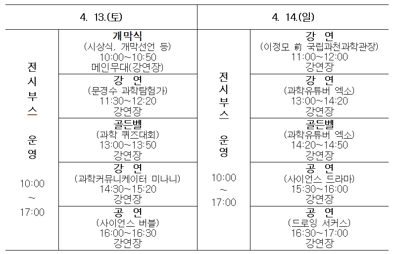 • 주요 내용: 개막식, 시상식은 물론, 주제별 전시관 운영과 기초과학을 직접 체험할 수 있는 체험부스 운영