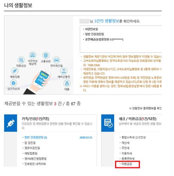 세금/미환급금 분야의 ‘미환급금’ 생활정보 클릭