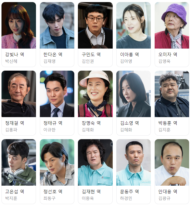 - 장명숙 (김재화 분): 강빛나가 살고 있는 황천빌라 주인으로, 틈만 나면 강빛나에게 막무가내 전도를 합니다.