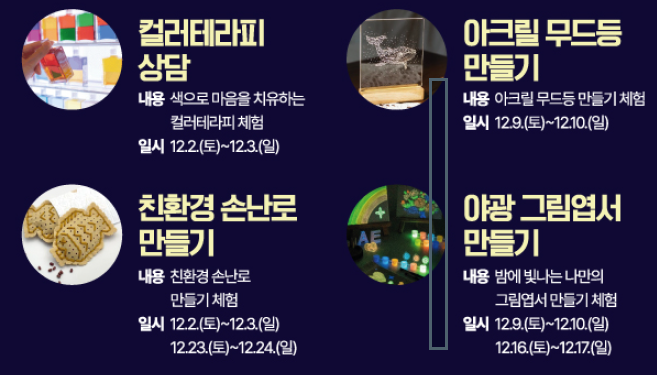 아름다운 빛 조형물 포토존과 다양한 프로그램 등을 준비한다고 하니 가족들과 방문해서 좋은 추억 쌓으시길 바랍니다.