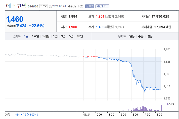 - 전 거래일 대비 22.51% 하락한 1,460원으로 거래를 마감했습니다.