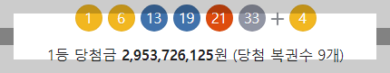 - 당첨번호: 1, 6, 13, 19, 21, 33번