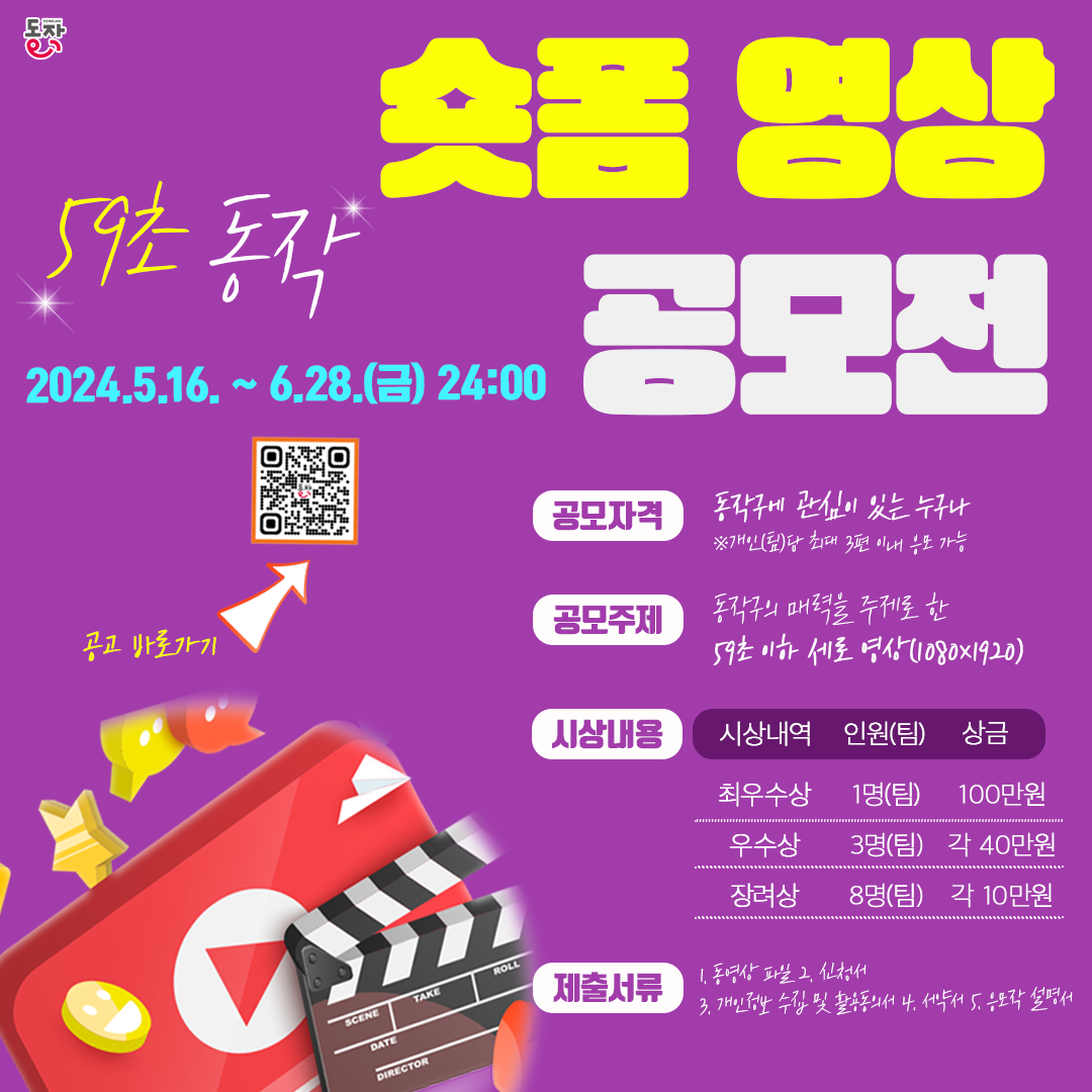 - 동작구는 2024년 지역 홍보와 주민 참여 활성화를 위해 영상 공모전 「59초 동작」을 개최할 예정입니다.